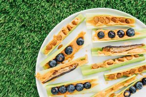 : Use a butter knife to spread a bit of peanut butter onto each celery. Top with your optional toppings.